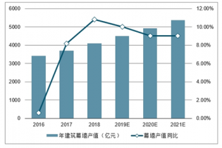 2016-2021年中國建筑幕墻產(chǎn)值及同比增長走勢預測