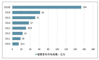 2010年,我國(guó)智慧停車市場(chǎng)規(guī)模僅為14.5億元,到2016年市場(chǎng)規(guī)模已增至62億元。隨著后期城市停車難、停車貴等問(wèn)題凸顯,智慧停車將成為城市發(fā)展的主要需求。未來(lái)幾年,市場(chǎng)規(guī)模以20%左右的速度繼續(xù)增加,到2020達(dá)到154億元。