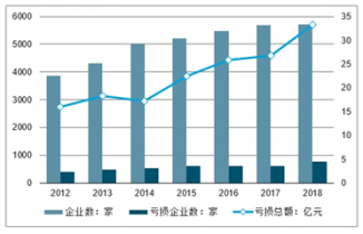 2012-2018年中國企業(yè)數(shù)量、企業(yè)虧損數(shù)量及虧損總額情況