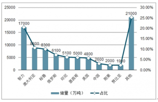 圖表18:2019年智利銅礦資源儲量及占全球比重(單位:萬噸,%)