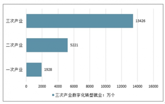 2018年我國第.一產業數字化轉型相關崗位約有1928萬個,第二產業數字化轉型崗位為5221萬個,第三產業數字化轉型崗位約13426萬個。