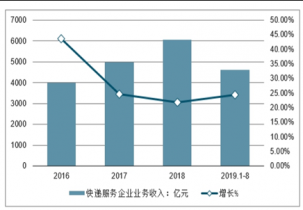 2019年1-8月,中國快遞服務(wù)企業(yè)業(yè)務(wù)量累計完成383.1億件,同比增長26.6%;業(yè)務(wù)收入累計完成4621.8億元,同比增長24.4%。2019年中國快遞業(yè)務(wù)量有望突破600億件。