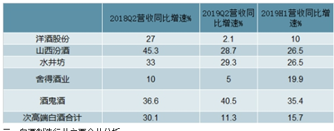 2019年上半年白酒上市公司營收、凈利潤分別增19.4%、25.6%,分別超食品飲料上市公司營收、凈利5.8個(gè)百分點(diǎn)、4.3個(gè)百分點(diǎn),在食品飲料主要子行業(yè)中營收增速最快。