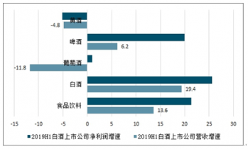 2019年上半年白酒上市公司營收、凈利潤分別增19.4%、25.6%,分別超食品飲料上市公司營收、凈利5.8個百分點(diǎn)、4.3個百分點(diǎn),在食品飲料主要子行業(yè)中營收增速最快。