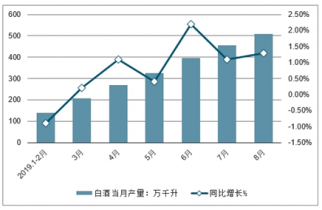 2019年8月,中國規(guī)模以上白酒企業(yè)產量52.6萬千升,同比增長2.1%。2019年1-8月,中國規(guī)模以上白酒企業(yè)累計產量508.3萬千升,同比增長1.3%。