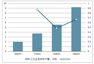 16H1-19H1三元正極材料產(chǎn)量及增長
