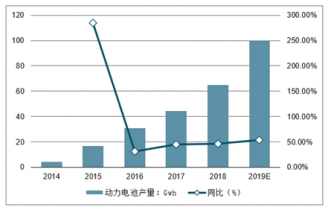2014-2019年中國動力電池產量及增長走勢