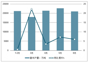 1-6月,建材行業增加值同比增長10.0%,主要建材產品生產總體保持平穩。其中,全國水泥產量10.4億噸,同比增長6.8%,平板玻璃產量4.6億重量箱,同比增長6.8%。商品混凝土、陶質磚、瓷質磚、衛生陶瓷制品、中空玻璃產量同比分別增長14.0%、11.8%、8.6%、10.3%、9.3%。