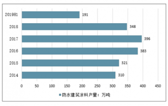 在我國建筑涂料產量中,防水建筑涂料占比最高,約占60%。2018年防水建筑涂料產量達到348萬噸,2019年上半年產量達到191萬噸。