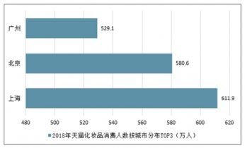 2018年天貓化妝品消費人數按城市分布TOP3(萬人)