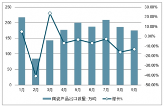 2019年1-9月中國陶瓷產(chǎn)品出口數(shù)量及增長情況