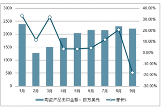 2019年1-9月中國陶瓷產(chǎn)品出口金額及增長情況