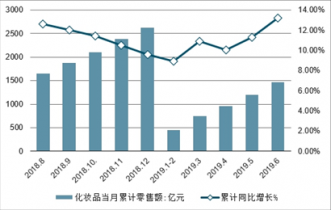 2018-2019年6月全國化妝品零售額及增長走勢