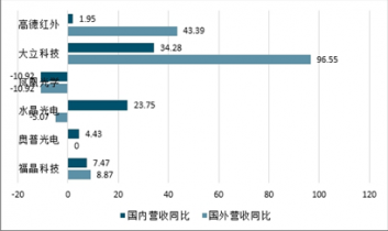 國內(nèi)營收最高的是水晶光電,達(dá)到11.99億元,其增長主要是由于手機(jī)雙攝、多攝滲透率提升,產(chǎn)品數(shù)量增多;大立科技在國內(nèi)和國外市場(chǎng)中的區(qū)域營收漲幅最大,分別為34.28%和96.55%,這主要得益于2018年軍品訂單持續(xù)恢復(fù),民品訂單保持同步高速增長;高德紅外國內(nèi)市場(chǎng)營收遠(yuǎn)超國外市場(chǎng),抓住了傳統(tǒng)軍工業(yè)務(wù)恢復(fù)性增長契機(jī)。