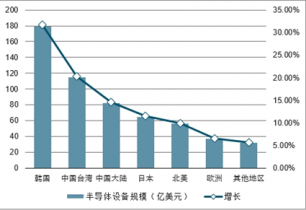 2017年韓國為全球第.一大半導體設備市場,市場規模179.5億美元,占比為31.70%,主要因為三星成立半導體代工業務部門,芯片及芯片外包業務需求持續增長;中國臺灣半導體設備市場規模114.9億美元,占比20.29%,喪失連續五年的第.一寶座,主要是因為臺灣半導體所依賴增長的PC市場進入衰退期,智能手機增速趨緩;中國大陸是全球第三大半導體設備市場,市場規模為82.3億美元,占比為14.54%。