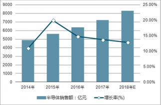 2014-2018年中國(guó)半導(dǎo)體產(chǎn)業(yè)銷售額及增長(zhǎng)走勢(shì)