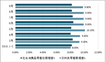 2019年1-9月全國飲料零售額及社會消費(fèi)品零售總額增速對比