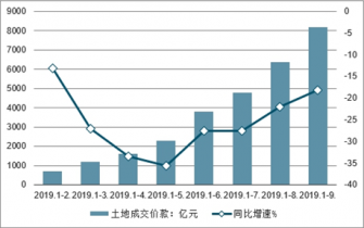 2019年1-9月,房地產(chǎn)開發(fā)企業(yè)土地購置面積15454萬平方米,同比下降20.2%,降幅比2019年1-8月收窄5.4個百分點;土地成交價款8186億元,下降18.2%,降幅收窄3.8個百分點。