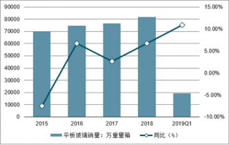 2015-2019年中國平板玻璃銷量及同比增長(zhǎng)走勢(shì)