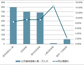 次,同比增長9.5%,國內過夜游客685.45萬人次,同比增長9.4%,入境過夜游客14.68萬人次,同比增長14.7%;12月接待一日游游客人數98.95萬人次,同比增長2.5%。1-12月旅游總收入為950.16億元,同比增長14.5%;12月旅游總收入102.86億元,同比增長9.3%。其中:國內旅游收入96.76億元,同比增長8%;旅游外匯收入9032.64萬美元,同比增長34.1%。