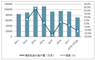 2011-2018年輪胎行業(yè)產(chǎn)量及增長變化(單位:萬條,%)