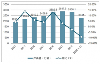 2018年,除2月份外,其余月份銷量均高于2017年同期。2018,汽車銷售市場連續(xù)出現(xiàn)負增長,全年增速下降至2.8%,總體壓力較大。2012-2017年中國汽車整車制造行業(yè)汽車銷量呈現(xiàn)增長趨勢。2018年,中國汽車銷量首次出現(xiàn)負增長,實現(xiàn)銷量2808.1萬輛,同比下降2.8%。2019年1-11月,中國汽車銷量為2311萬輛,較上年同期下降9.1%。