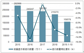 2015-2019年1-10月中國液晶顯示板進(jìn)口數(shù)量及增速趨勢圖