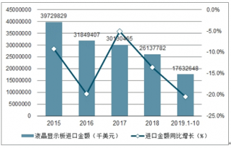 2015-2019年1-10月中國液晶顯示板進(jìn)口金額及增速趨勢圖