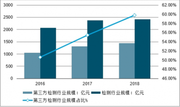 2016-2018年中國第三方檢測(cè)行業(yè)規(guī)模及占比檢測(cè)比重情況