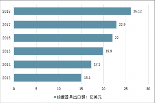 2017全年我國(guó)按摩椅出口總額為22.9億美元,行業(yè)總體出口形勢(shì)向好,2018年,中國(guó)按摩器具出口額為26.12億美元,呈持續(xù)提升趨勢(shì)。