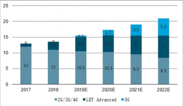 而按照不同網絡制式拆分來看,數據顯示,5G射頻前端全球市場規模將會從2018年的0增長至2022年的55億美元,而LTEAdvanced射頻前端市場規模將會從2018年的25億美元增長至至2022年的70億美元,2G/3G/4G的射頻前端市場規模將會從2018年的110億美元下降至2022年的85億美元。