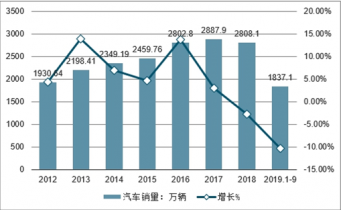 2018年中國(guó)汽車實(shí)現(xiàn)銷量2808.1萬(wàn)輛,同比下降2.8%,首次出現(xiàn)負(fù)增長(zhǎng)。2019年1月至9月中國(guó)新車銷量為1837.1萬(wàn)輛,同比下降10.3%。