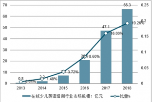 2013-2018年中國在線少兒英語培訓(xùn)市場需求規(guī)模及比重情況(單位:億元,%)