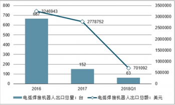 2016-2018年1季度電弧焊接機(jī)器人出口情況走勢(shì)圖(單位:臺(tái)、美元)