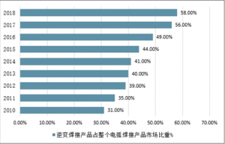 2017年逆變焊接產(chǎn)品市場占整個電弧焊接產(chǎn)品市場比重已超過一半,達(dá)到56%,2018年提升約58%。