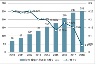 2010-2018年中國逆變焊接產(chǎn)品市場容量及增長走勢