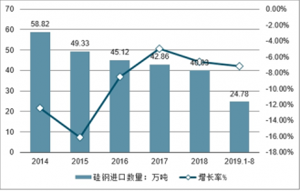2014-2019年中國硅鋼片進(jìn)口數(shù)量及增長走勢