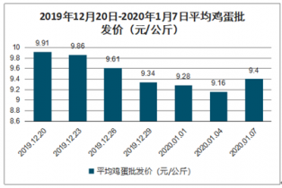 從2019年12月20日-2020年1月7日這段時間來看,雞蛋平均批發(fā)價維持在9-10元/公斤的區(qū)間內(nèi),其中2020年1月7日雞蛋平均批發(fā)價為9.4元/公斤。2019年12月20日為這段時間雞蛋平均批發(fā)價最高的一天,為9.91元/公斤,其次12月23日平均批發(fā)價也較高,為9.86元/公斤。12月31日為這段時間雞蛋平均批發(fā)價最低的一天,為9.04元/公斤。
