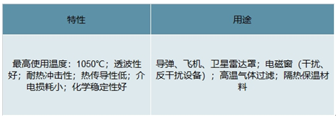 軍用石英產品包括石英纖維棉、石英纖維紗、石英纖維氈、石英纖維布、 石英纖維套管和短切石英纖維等。得益于優越的耐高溫、透波性能、耐 熱沖擊性等,石英纖維制品在軍工領域得到了大量應用,主要用作軍用 雷達罩、導彈頭防護層、飛船倉門蓋和隔熱保溫材料等。