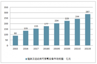 2016年中國健身及運動類可穿戴設備市場規模為135億元左右,預計到2022年這一市場將達到287億元。