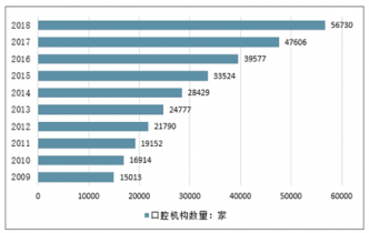 民營口腔醫(yī)療機構(gòu)不斷壯大,市場上機構(gòu)數(shù)量近10萬家。2018年我國在工商局注冊登記的民營口腔醫(yī)療機構(gòu)達到56730家,同比增長19.17%;考慮到未注冊的部分(早年間民營口腔診所開辦無需工商登記),截至2018年底我國口腔機構(gòu)數(shù)量超過8萬家。