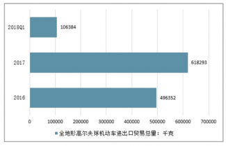 2016年我國全地形高爾夫球機動車進出口貿易總量496352輛 ,2017年進出口貿易總量618293輛 ;2018年1季度進出口貿易總量106384輛 。