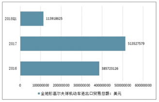 2016年我國全地形高爾夫球機動車進出口貿易總額385723126美元,2017年進出口貿易總額513527579美元;2018年1季度進出口貿易總額113918625美元。