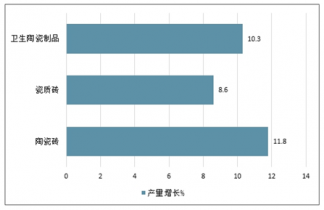 2019年,因建材行業(yè)回暖,主要建材產(chǎn)品生產(chǎn)總體保持平穩(wěn)。其中,陶質(zhì)磚、瓷質(zhì)磚、衛(wèi)生陶瓷制品產(chǎn)量同比分別增長(zhǎng)11.8%、8.6%、10.3%。