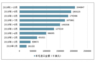 2019年1-10月中國羊毛進口金額為2046847千美元,同比下降26%。