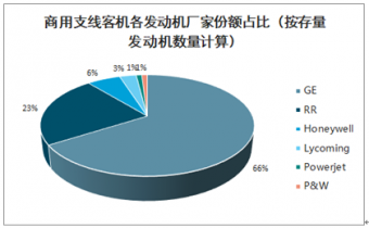 GE領跑支線客機發動機市場。新一代支線客機發動機市場的競爭主要在GE、RR和PW三大公司之間展開。從現役機隊存量發動機市場份額來看,GE占66%,排名第一,其次是RR占22%,霍尼韋爾占比6%,普惠份額較小。