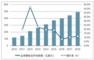 2010年,全球鋰電池市場規(guī)模約為120億美元,到2017年市場規(guī)模已大幅增長至442億美元;2018年全球鋰離子電池產(chǎn)業(yè)規(guī)模首次突破400億美元,市場規(guī)模達493億美元。
