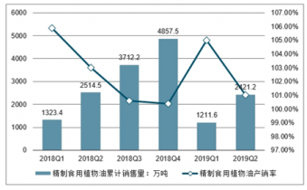 2018Q1-2019Q2中國精制食用植物油銷售量及產(chǎn)銷率情況