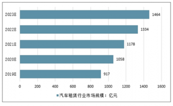 據(jù)相關(guān)數(shù)據(jù)顯示,預(yù)測2019年中國汽車租賃行業(yè)市場規(guī)模將達(dá)917億元,2020年中國汽車租賃行業(yè)市場規(guī)模將首次突破千億元,并預(yù)測在2023年中國汽車租賃行業(yè)市場規(guī)模將增長至1464億元左右,2019-2023年均復(fù)合增長率約為12.41%。