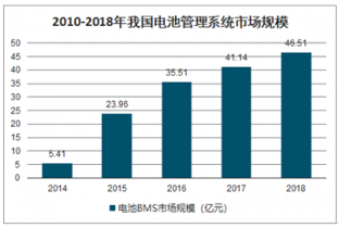 2014年,中國(guó)BMS還只有5.41億元的市場(chǎng),到2018年我國(guó)電池管理系統(tǒng)市場(chǎng)規(guī)模達(dá)到了46.51億元,近幾年我國(guó)電池管理系統(tǒng)市場(chǎng)規(guī)模情況如下圖所示: